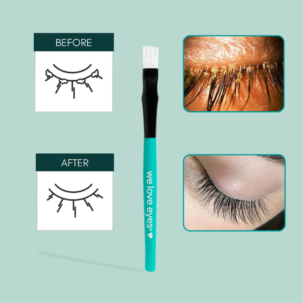 - Cleanse with spray & fork shaped brush to remove lash line debris when it appears