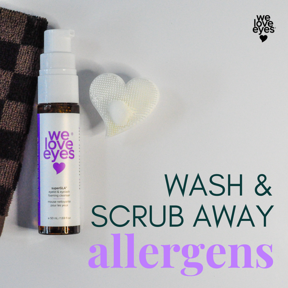 Dispense 1 pump of foam* onto cleansing mini mitt. With eyes closed, gently rub onto eyelids, eyelashes, & brows. Rinse off with water. Lastly, wash face with foaming cleanser to ensure pollen & dust are removed from the peri-orbital area. *Warning: Because this product is a soap, do not get into eyes.